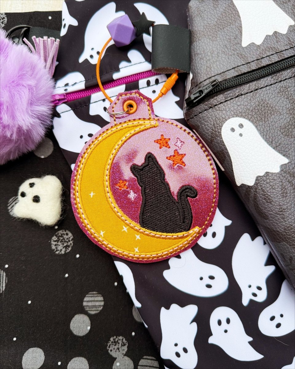 Add a little magic to your stitching with our Cat in the Moon Bag Tag! This in-the-hoop embroidery design features a silhouetted cat perched against a crescent moon—perfect for keychains, backpacks, purses, or Halloween favors.