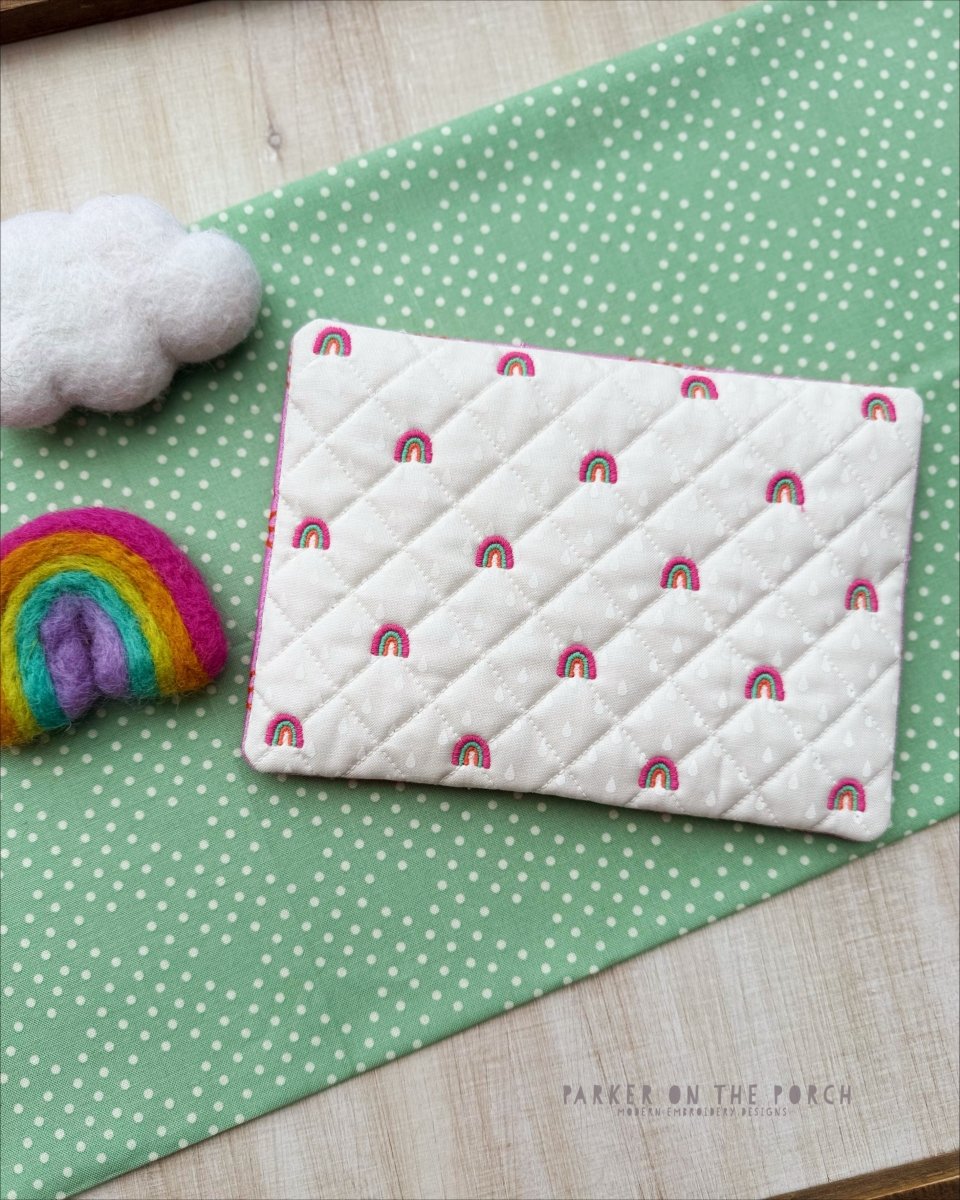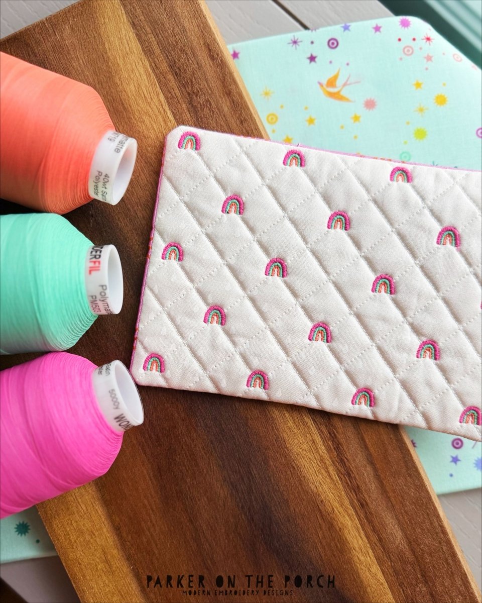 Brighten up your sewing with the Quilted Rainbow Mug Rug! Featuring a colorful quilted design and cheerful rainbow motif, this fun in-the-hoop project is perfect for using vibrant fabrics and adding a pop of color to your coffee break.