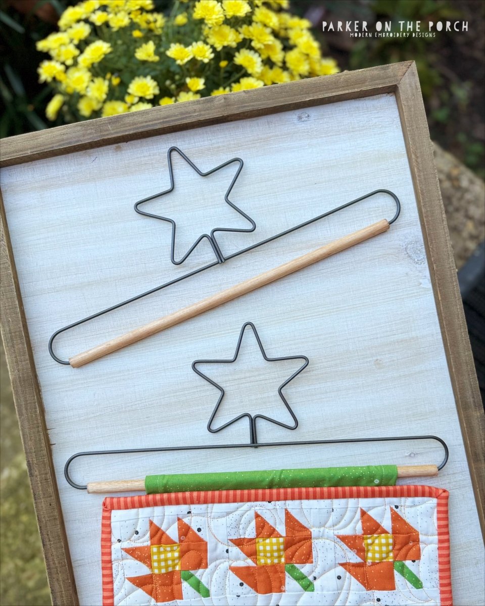 Showcase your mini quilts, banners, or wall hangings in style with this decorative Star quilt rack. Measuring 12" wide, it features a metal frame and a smooth wooden dowel—perfect for displaying your handmade creations while keeping the focus on your work.