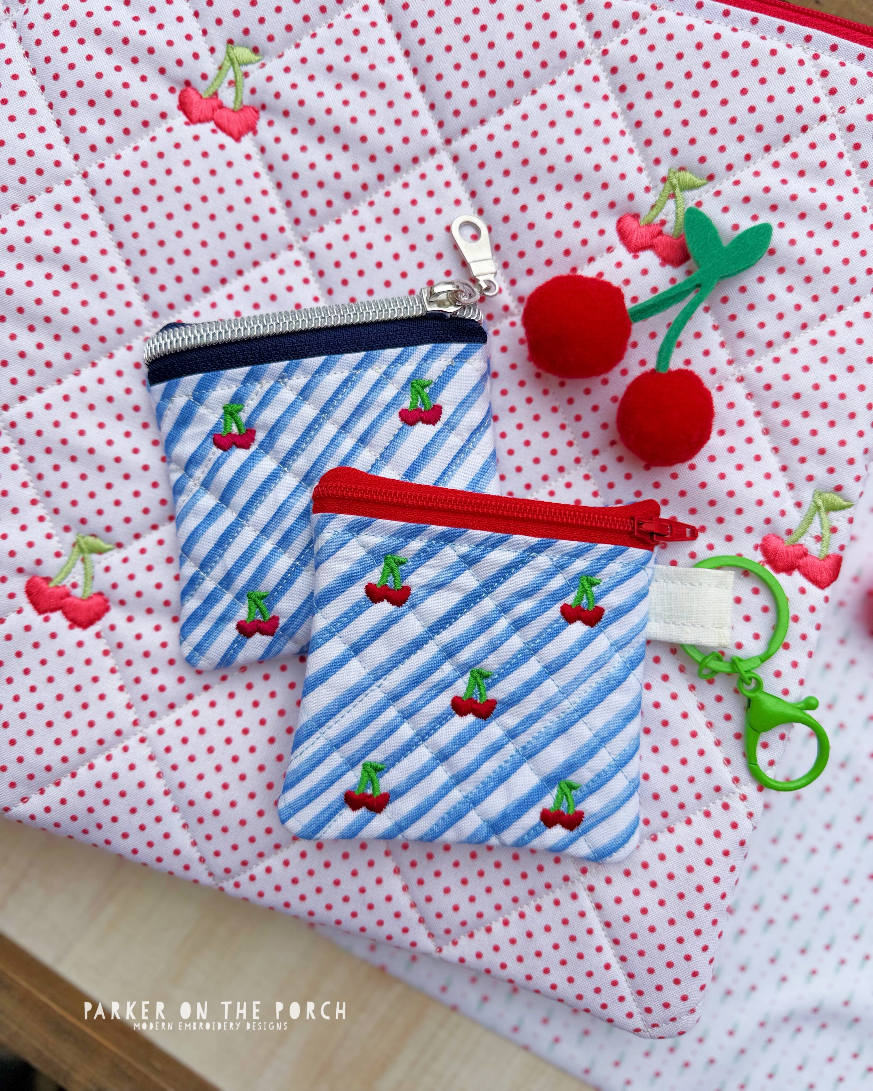 Add a touch of charm to your handmade gifts with this 4x4 Quilted Cherries Top Zip Zipper Bag! Fully made in the hoop, this design features a softly quilted front body, a sweet stitched cherry accent, and a smooth top-zip finish.